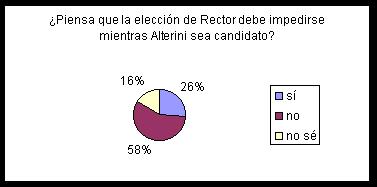 | 162 | No sé | Dudo que toda esta "movida" hubiera sucedido de no haber tenido chances de ganar Alterini (por que no se impugno su candidatura?). No obstante creo conveniente la reforma del Estatuto. Supongo que existe la posibilidad de realizar una Asamblea extraordinaria para tal fin, aunque admito que desconozco en función del actual estatuto (único marco legal por ahora vigente) si esto puede llevarse a cabo aun en situación de acefalía del cargo máximo y no habiéndose violado (hasta donde se) ninguna de las normas establecidas para elegirlo. Mi postura personal es que, dada la crisis gestada, sería conveniente elegir en forma transitoria a un "rector" o "autoridad interviniente equivalente", por un periodo razonable (120 días??) en el cual se tratara en forma intensiva el tema de la reforma estatutaria y, una vez realizada (o no..., dependiendo del numero de votantes que estén o no de acuerdo con ello), se llamara a elecciones definitivas nuevamente. Por eso no hablo de meramente "impedir" o "no impedir" la elección de un rector. | No | Por lo expuesto anteriormente para mi el problema de la candidatura de Alterini es secundario respecto del de la reforma estatutaria (aunque sus "chances de ganar" hayan sido el factor desencadenante de este asunto). | Ninguno | Más allá de quien quisiera que fuera rector, mi posición actual es que debe elegirse a uno (o una autoridad "equivalente") TRANSITORIAMENTE según lo permita el MARCO LEGAL VIGENTE. Luego tratar en forma intensiva y DEMOCRÁTICA la posibilidad de reformar el estatuto en un plazo establecido de antemano, y, una vez definido esto, convocar finalmente a elecciones definitivas con la lista de candidatos legalmente idóneos. |